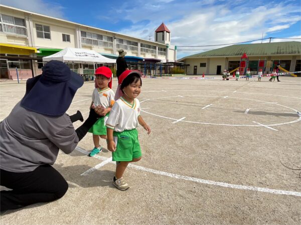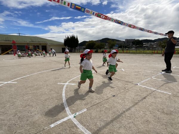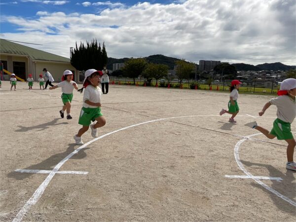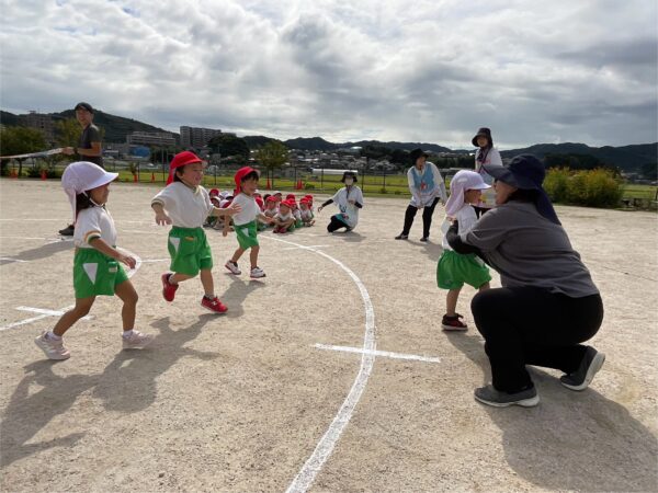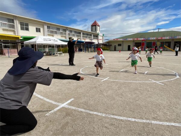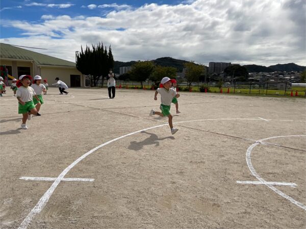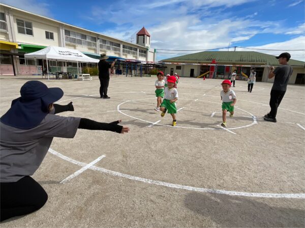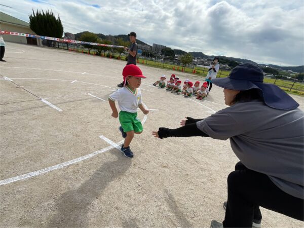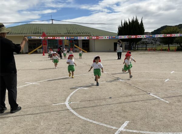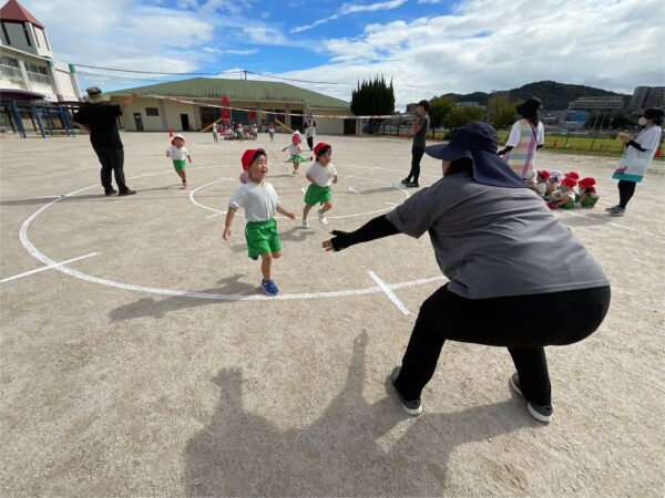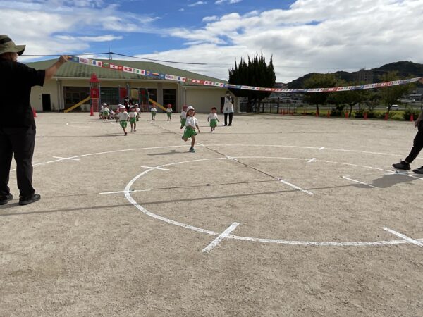 「きをつけ、よーいどん!!」の合図でゴールの園長先生を目指して走ります😊