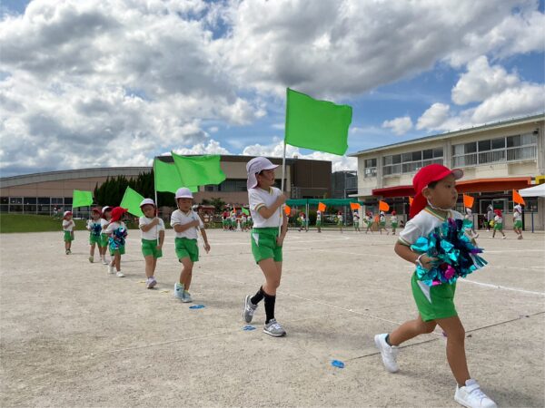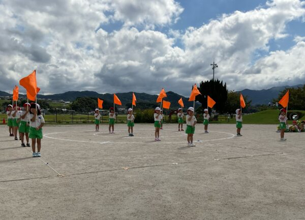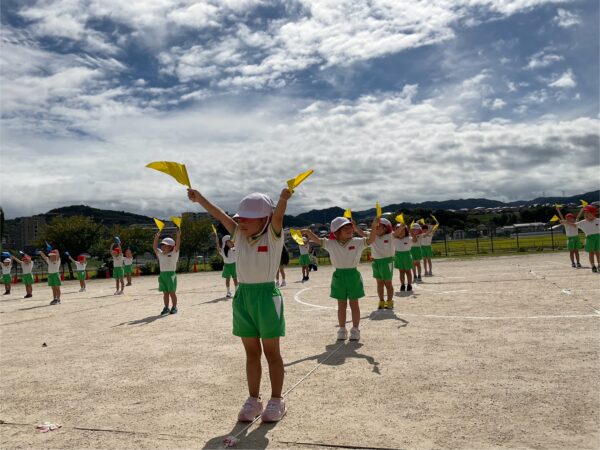 年中組のうさぎ組は青色、りす組は黄色の小旗を持って元気に踊ります😊💕