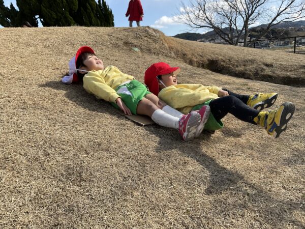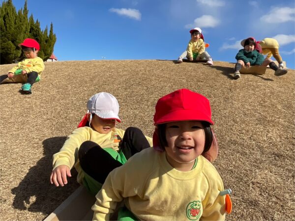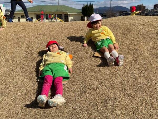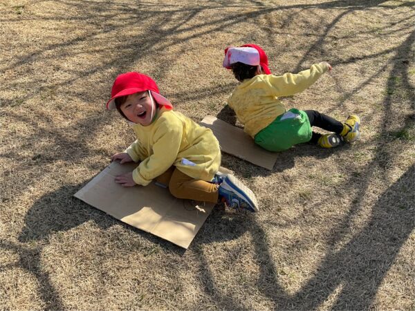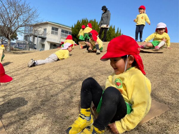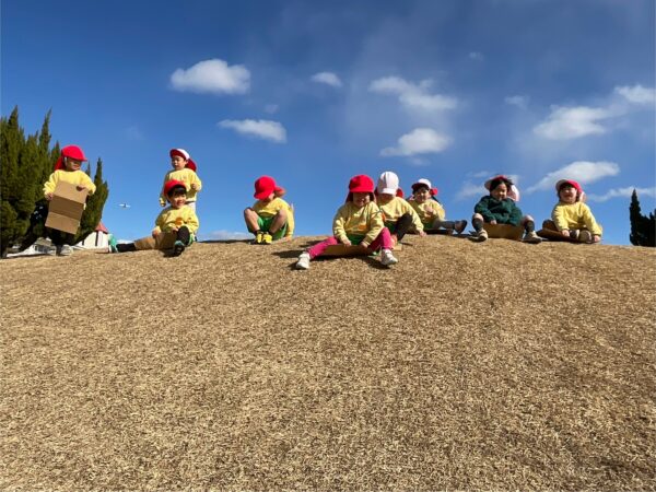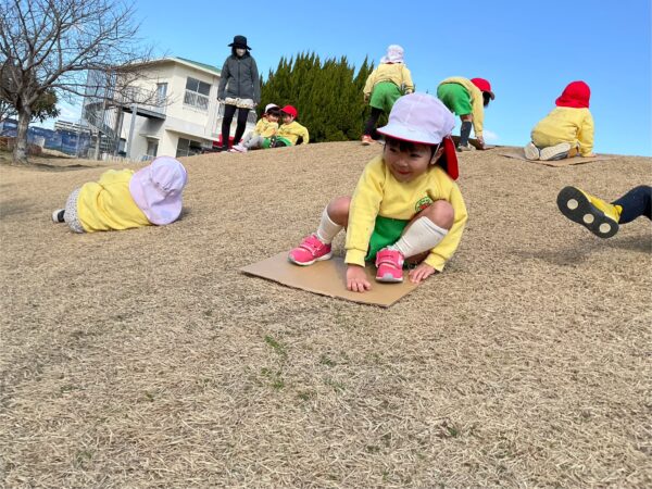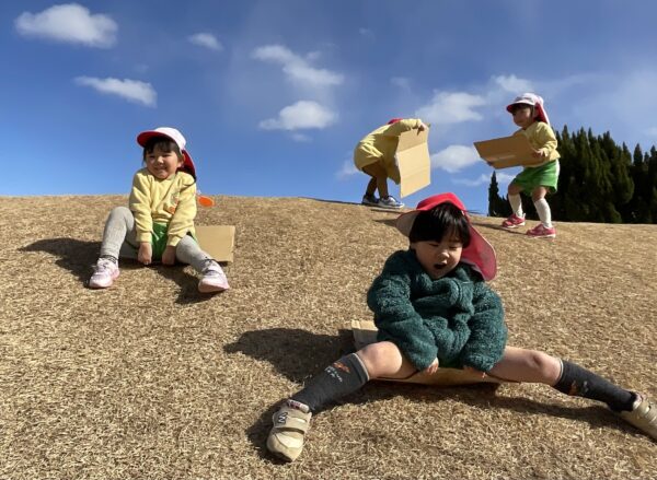 幼稚園のお山では段ボールを使い、山滑り遊びをしたり・・・💕