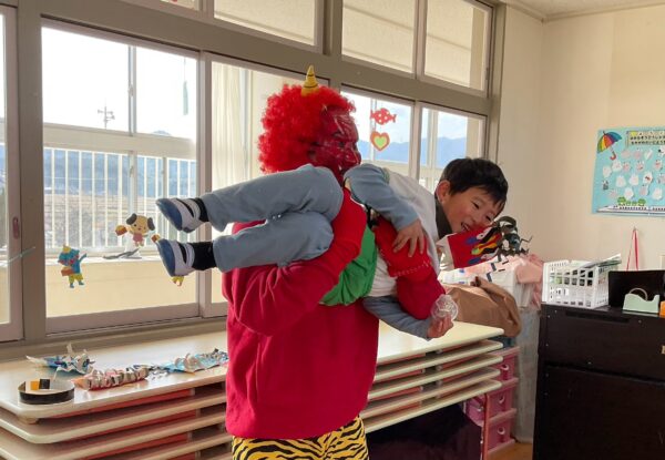 事前に「鬼さんは先生たちのお友だちで優しいよ」と伝えていたこともあり、怖がっている子は少なかったのですが、いざ鬼がやってくると、びっくりしてポカーンと表情が固まる子どもたち😊
