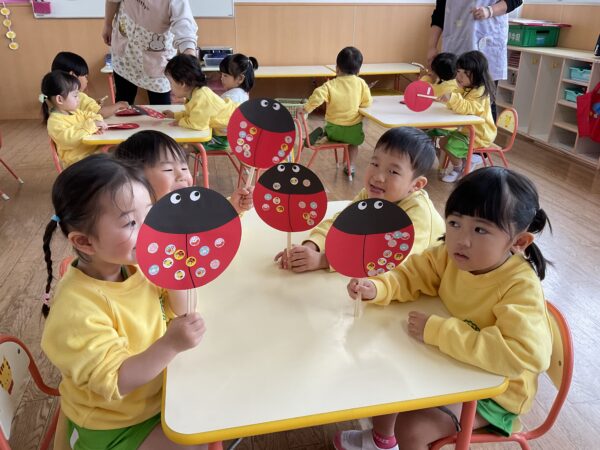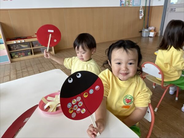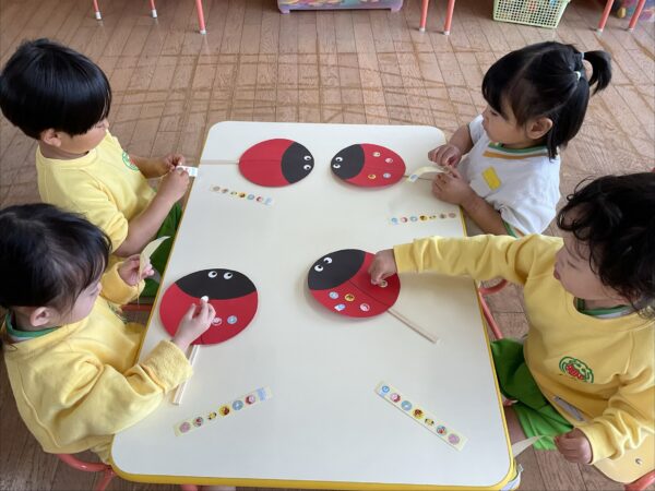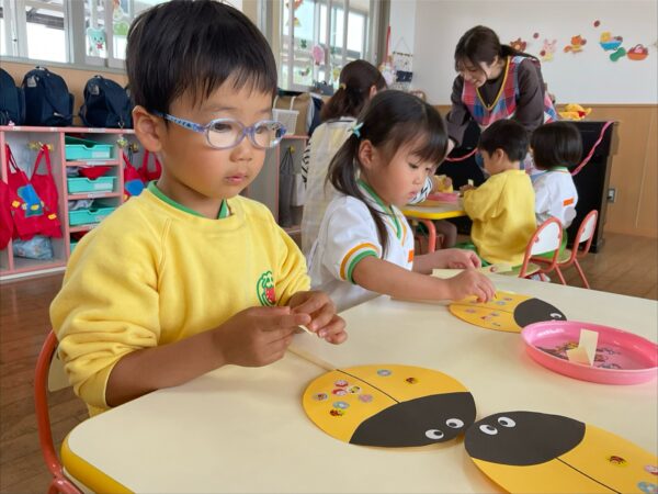 シールを沢山貼って、可愛いテントウムシを作っていきます😊