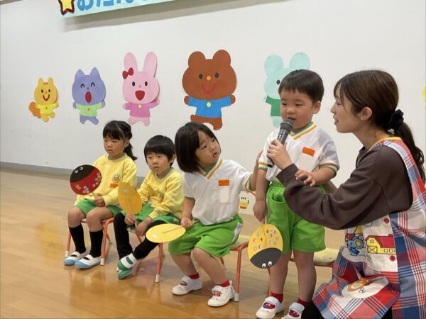 毎月のお誕生日会では、ステージの上でインタビューに答えるので、その練習もしてみました🎶